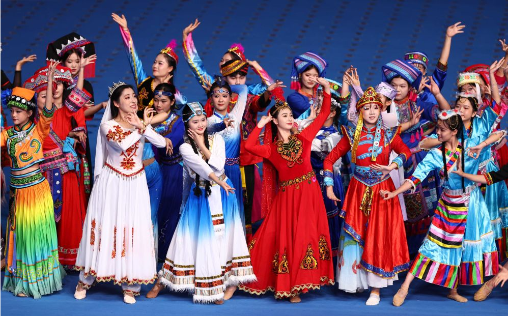 南海之畔,共襄盛会。三亚市体育中心内,56个民族欢聚一堂,共同奏响中华民族一家亲、同心共筑中国梦的华美乐章。20时,开幕式正式开始,各代表团和现场3.5万名观众迎接国旗仪仗队入场,全国少数民族传统体育运动会会旗和第十二届全国少数民族传统体育运动会会旗相继入场,随后全国31个省(自治区、直辖市)、新疆生产建设兵团、香港、澳门代表团和台湾少数民族代表团步入会场。各代表团进行了30秒的驻停表演,呈现了中华民族大家庭各族儿女携手奋进的昂扬风貌。