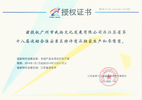 本公司(广州市我扬文化发展有限公司)作为江苏省第十八届运动会特许商品独家生产商与独家经销商,现面向社会公开征集特许产品零售商。入选企业在指定商业区域销售省运会特许产品。应征企业应拥有较强经济实力、能在全市范围布局多个零售网点的省运会特许零售商的企业或个人独家加盟,具有两年以上营业及管理经验为佳。零售业态分为以特许专柜形式存在的连锁店、以特许专柜形式存在的大型商超店以及及特许产品专卖店三种。