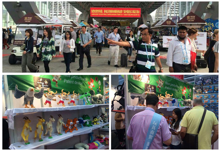 我司参加第117届中国进出口商品交易会参展现场,独具特色的吉祥物可站立功能使得一个个吉祥物公仔犹如精灵天使般迎接远到而来的客商,图中左下照片是部分新品展示,右下照片是我们的外贸业务员美女在向二位外商介绍新品。